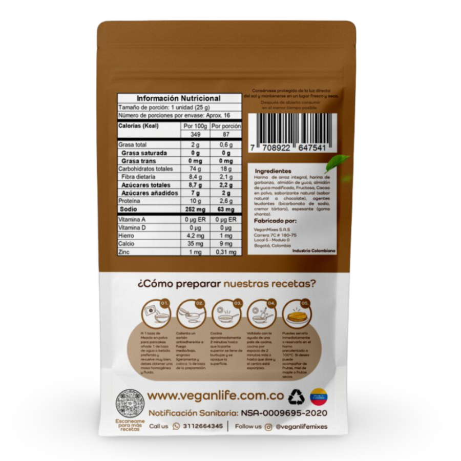 Mezcla lista para pancakes sin gluten sabor chocolate.